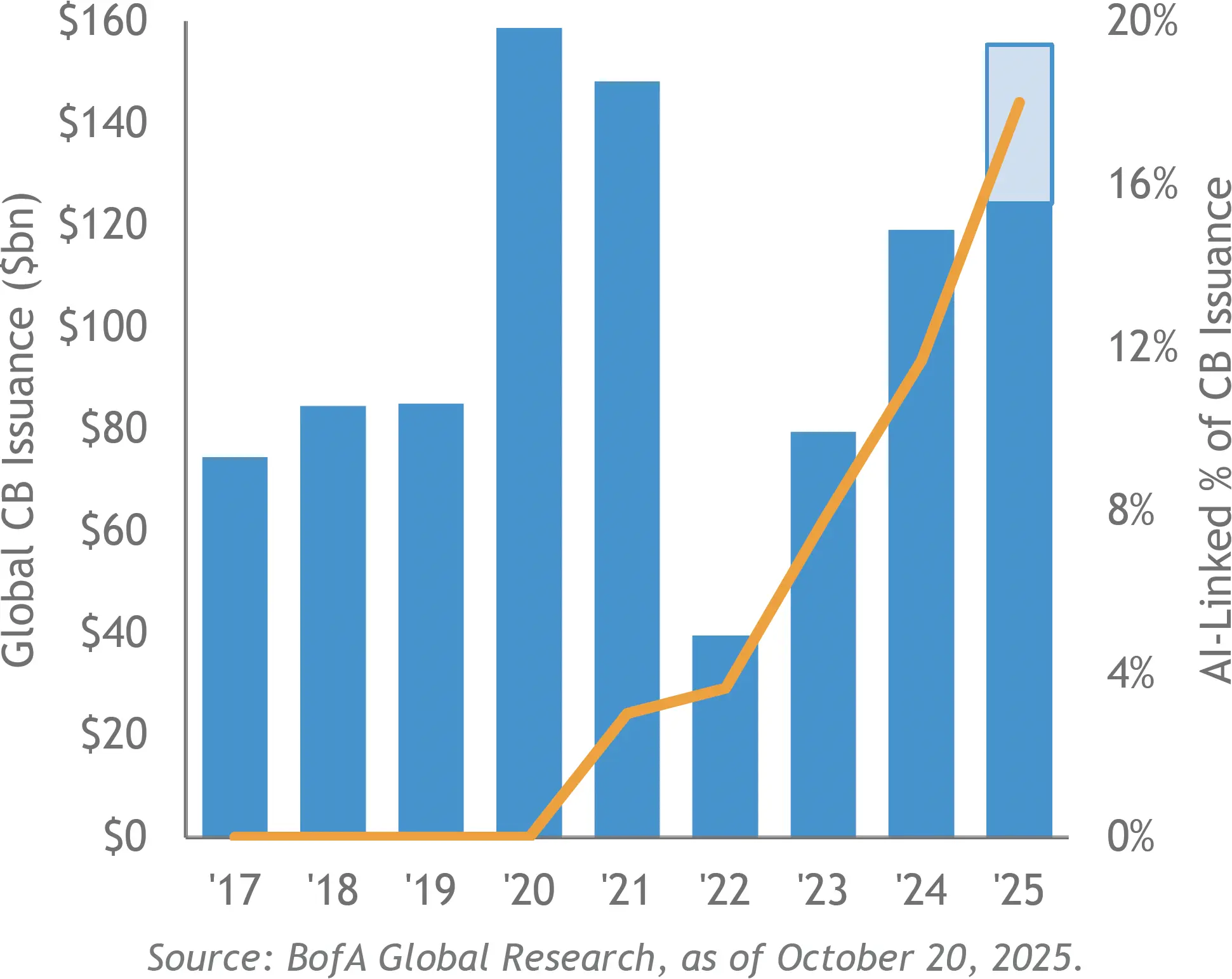 Stephane Mantelin: The most visible impact has been a surge in issuance, driven by massive capex across a broad range of sectors—from building advanced data centers and upgrading cloud infrastructure to expanding energy generation capacity. Given the convertible bond market has long served as a key financing channel for growth and technology companies, this sudden wave of AI-linked issuance is not unexpected. In fact, it is estimated that roughly one-fifth of all new global convertible bond issuance in 2025 is tied to the AI ecosystem.1